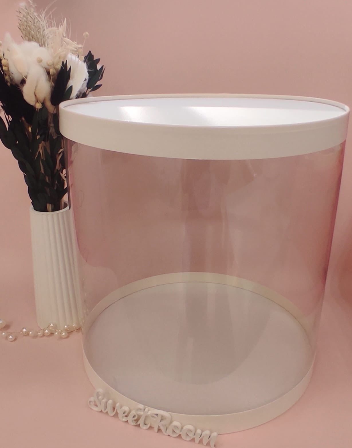 Коробка для торта прозрачная ТУБУС диам.300мм выс.300мм (белая/золото)